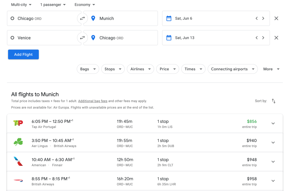 Here I’ve entered leaving from Chicago and arriving in Munich, then departing from Venice and flying back to Chicago all on one ticket.