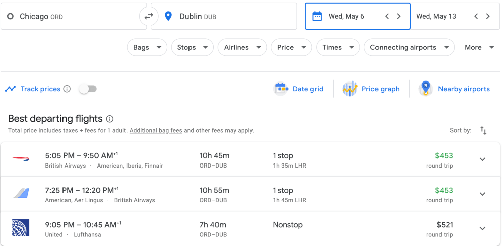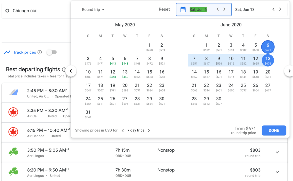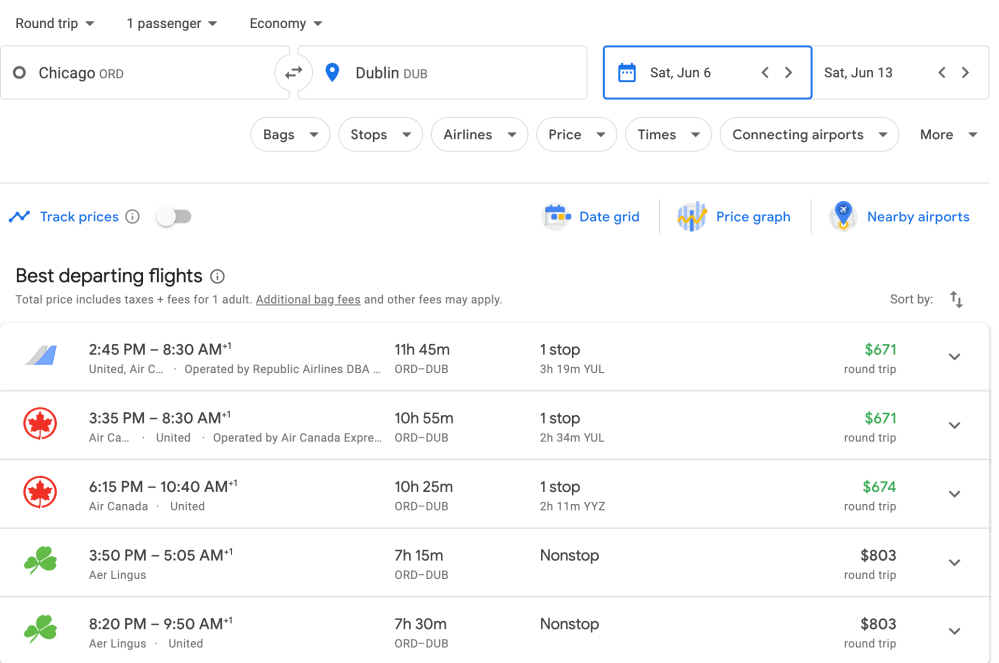 I put Chicago to Dublin into Google flights from June 6-13 and a variety of different airline choices come up:
