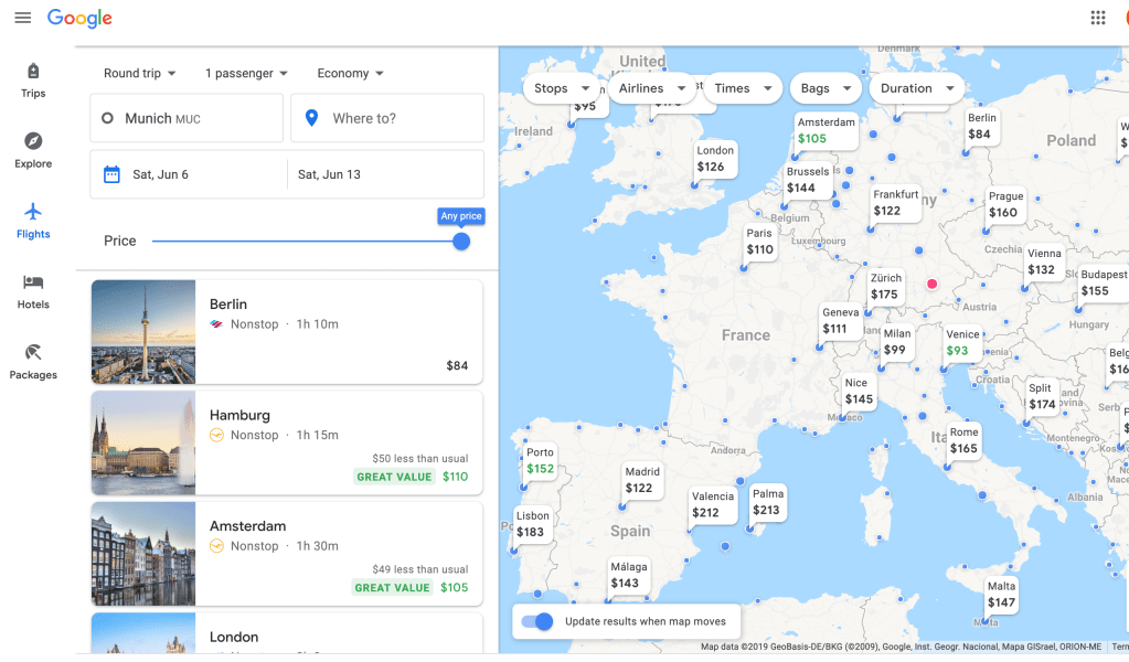 I used the explore feature to see where I could go from Munich. Looks like Venice is a good value!