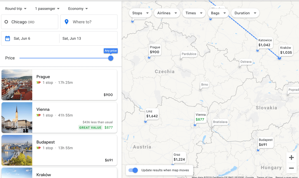 Here you can see how Budapest is significantly cheaper for these dates than Prague (and it was even more of a difference when we went). It appears like Vienna is pretty inexpensive with a “great value” of $877, but the trip is 41 hours long! Not such a good value after all.