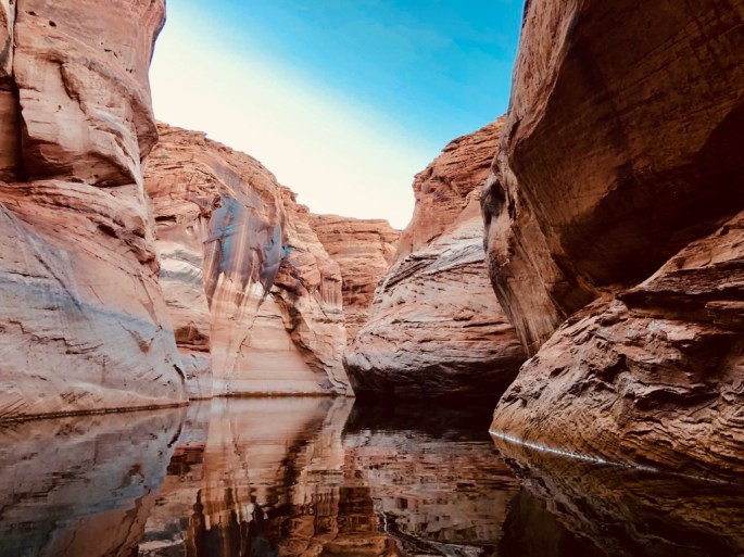 We enter the Antelope Canyon and the water becomes even calmer, except when a few jet skiis go by. There is a no-wake policy which some obey; some do not. The canyon walls seems to amplify their engine noise as well as the waves from their wake.