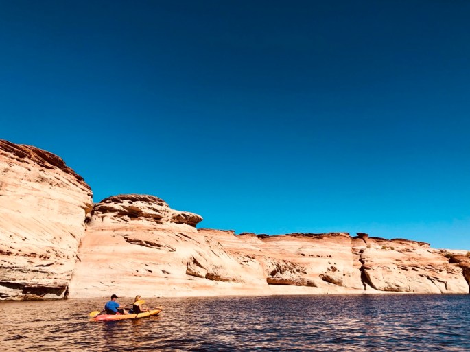 We rented our double kayaks from Lake Powell Paddleboards and Kayaks. I had thought we needed to rent a special carrier for the kayaks, but they simply tied them onto our friends’ existing car rack, using swim noodles as padding to protect the car. The workers, whom I could tell had loaded kayaks a few thousand times, were friendly, efficient and instructive on how to tie them on safely-which was hugely important to remember later on when we ended up tying them back on in the pitch dark! Off we went, to Lake Powell to put in at Antelope Point Launch Ramp.