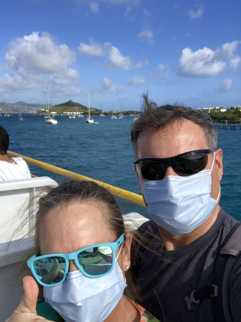 Our ultimate goal was St John, United States Virgin Islands. To get there, it is necessary to fly into St Thomas and then ferry over to St John. Luckily the St Thomas airport was organized. Everyone lined up outside the terminal to show a completed USVI travel portal app with COVID negative verified results before being allowed in. From there, we took a private transfer to the ferry dock, which our villa owner had helped arrange.The ferry over to St John is a short 20 minute ride and all open air, but masks were required.